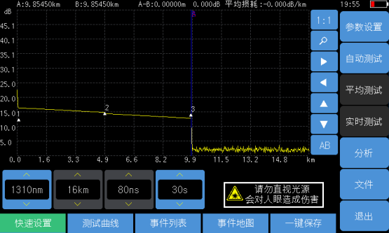 自動測試功能使得用戶無需了解更多的有關(guān)該儀器操作的細節(jié),測試步驟變得非常簡單,只需要進入“自動OTDR”,將光纖接入產(chǎn)品對應(yīng)OTDR端口、點擊【自動測試】按鈕即可,儀器會自動設(shè)置相應(yīng)的測試條件并給出最終測試結(jié)果,包括測試曲線和事件列表等。